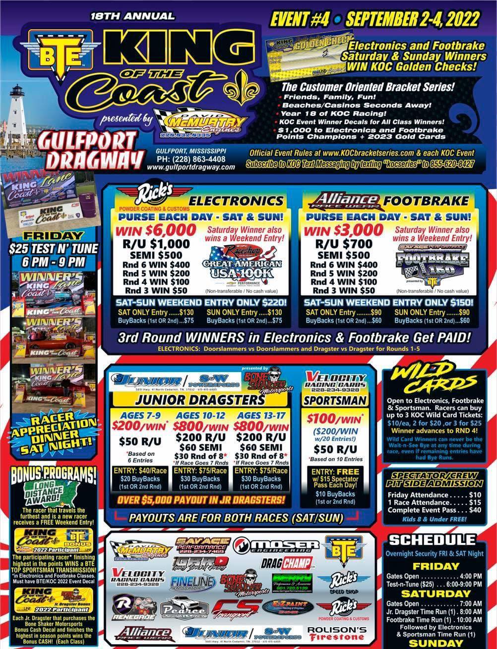 BTE KOC Presented by David McMurtry Racing Engines Event 4 Race Flyer Sept 2-4 at Gulfport Dragway.