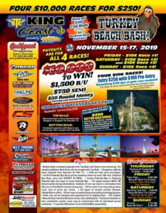 The BTE KOC Series Presented by David McMurtry Racing Engines is TWO WEEKS away from the Biggest Event the Series has promoted within 15 year History of the Series. The Turkey Beach Bash slated for Nov. 15-17 FEATURES 4 $10,000.00 to WIN RAces for $250. The event was capped at 282 + plus a 10% oversell that resulted in a sold out event.