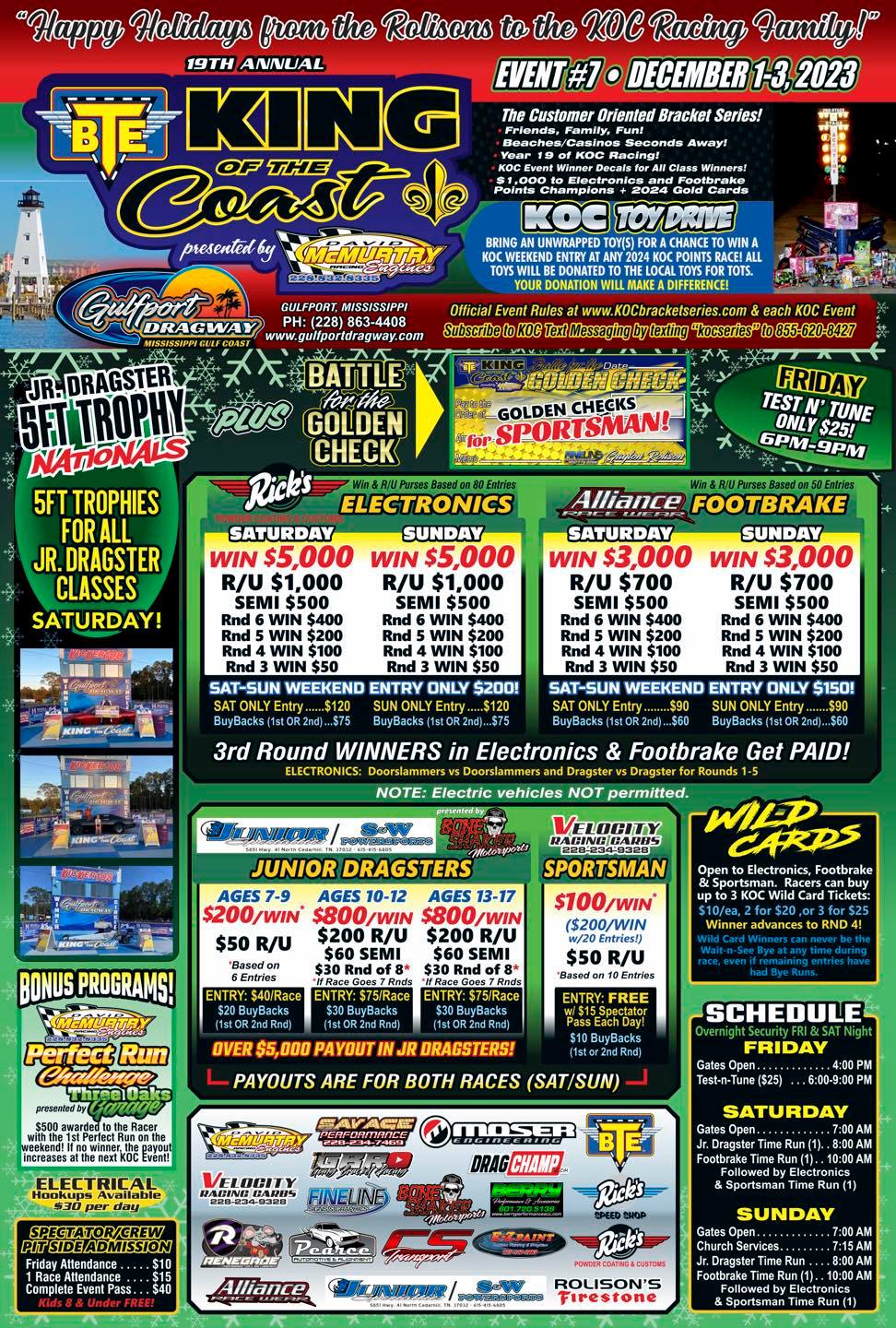 The 19th Annual BTE KOC Presented by David McMurtry Racing Engines Event 7 Season Finale Dec. 1-3 at Gulfport Dragway.