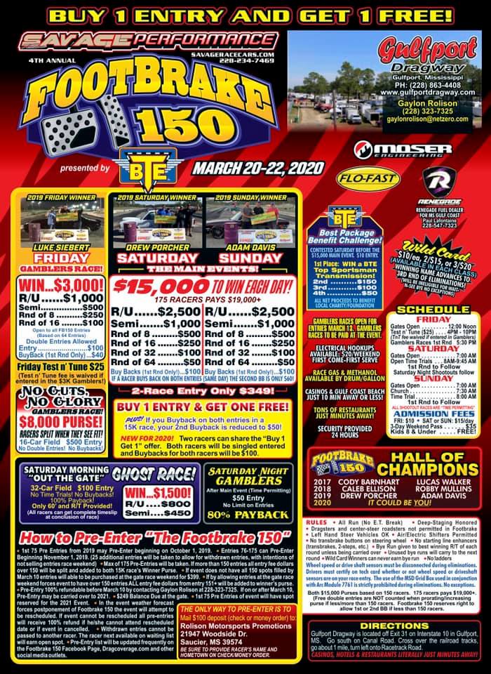Pre-Entry Kicks Off Oct. 1 for the first 75 racers listed below for the 4th Annual Footbrake 150. $100 to Pre-Enter and remaining $249 due at the gate.