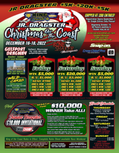 Registration for the BTE KOC Jr Dragster Christmas on the Coast Event Opens Sept 1 at 6pm CT at www.kocbracketseries.com or by clicking the registration link below
