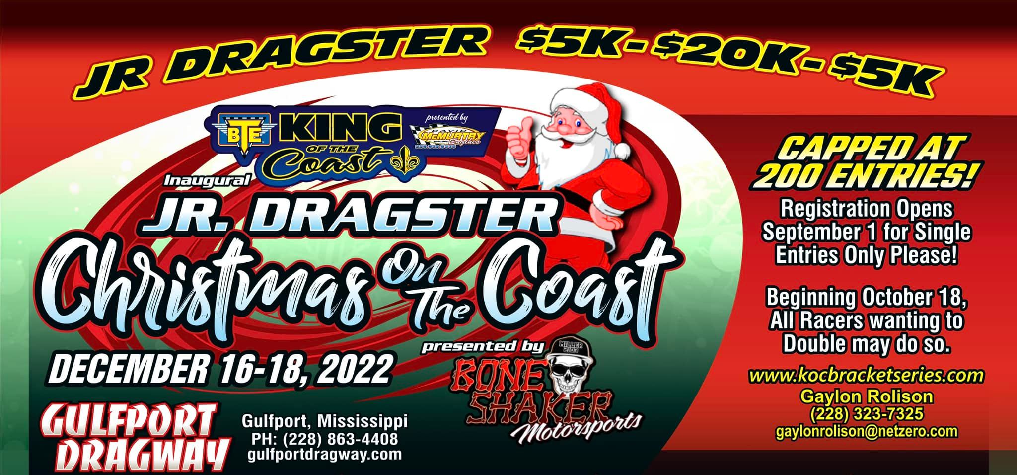 The BTE KOC Series Jr Dragster Christmas on the Coast 5K/20K/5K officially at 200 single Entries. The 10% oversell NOW in progress.